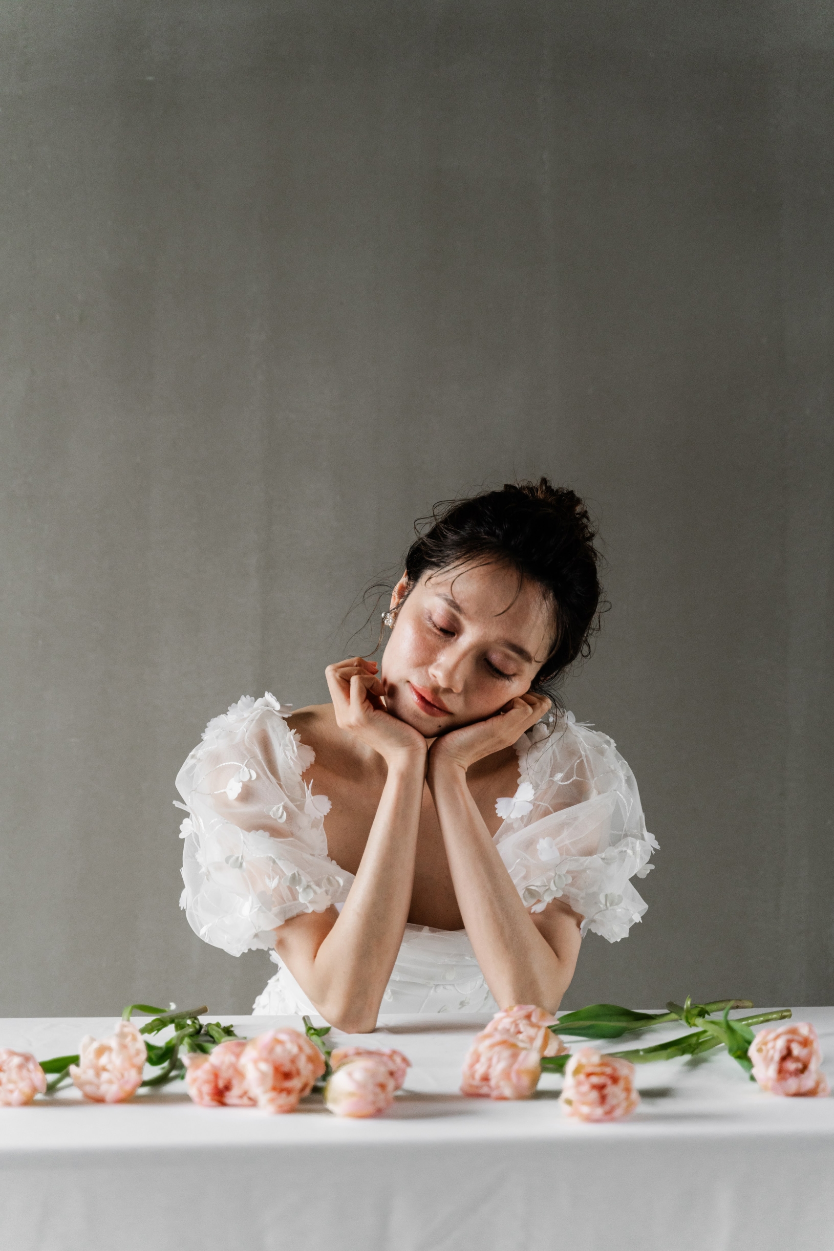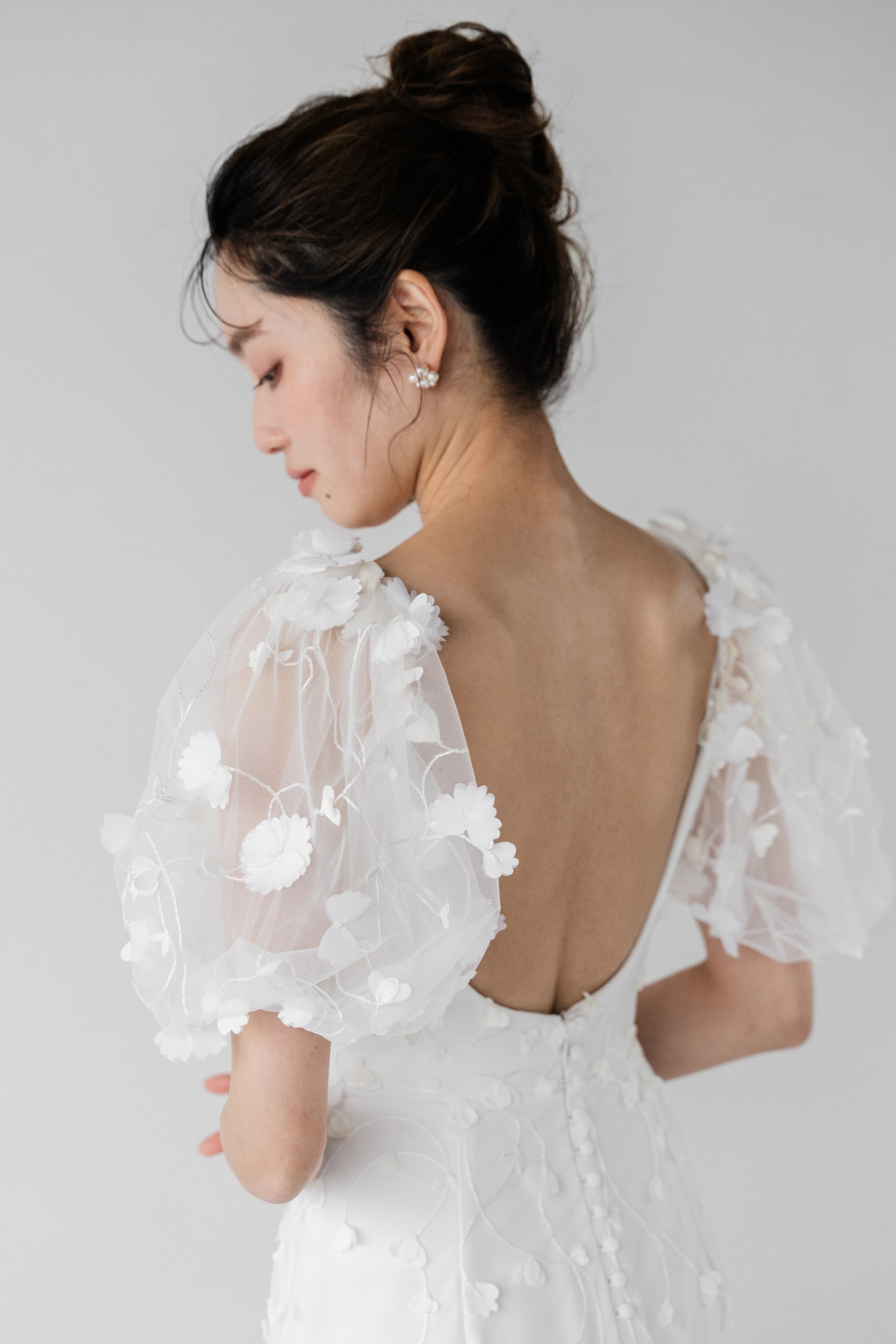 ボリュームに重さを感じさせることのない、透明感たっぷりなエアリーパフスリーブがお顔周りをより一層華やかに魅せてくれます。