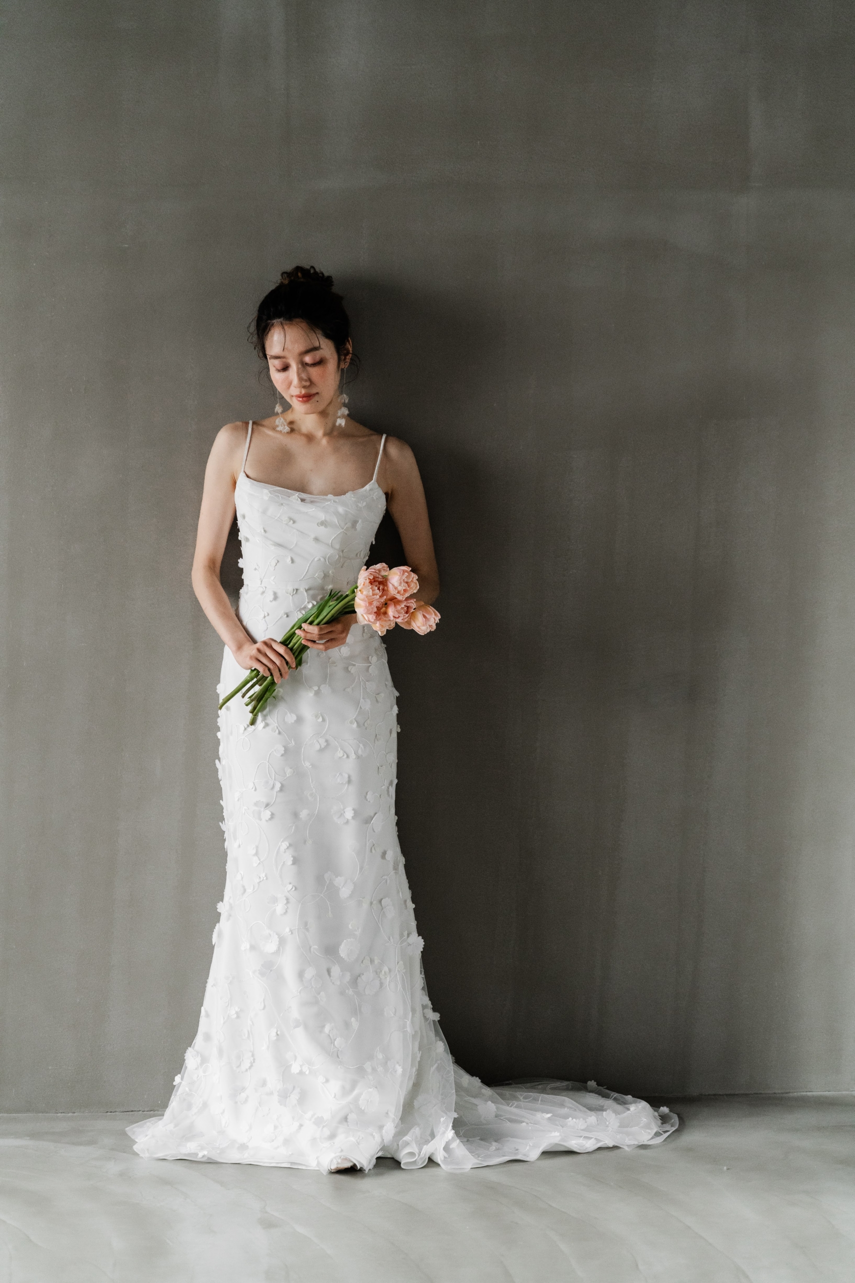 胸元や背中の肌見せはあるものの、気品のあるボタニカル刺繍によって楚々とした雰囲気を演出します。