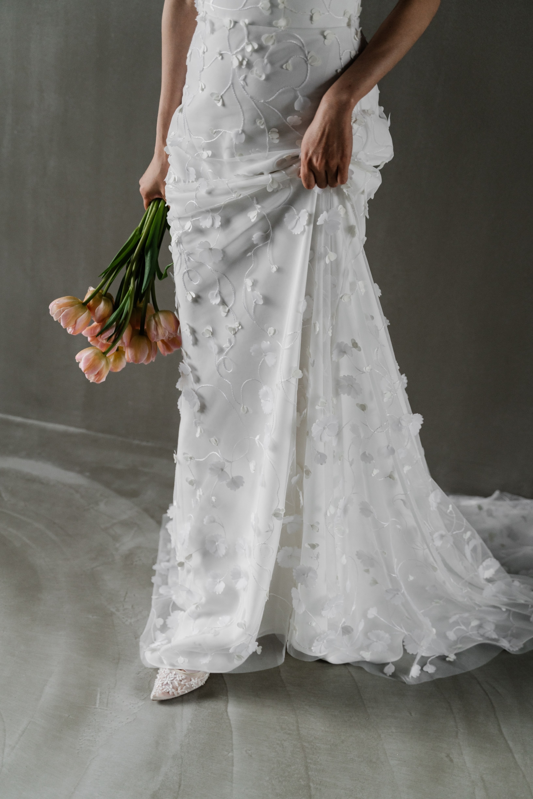 モチーフを繋ぐフラワーステムを刺繍糸にカスタマイズしているのはBeacon Dressだけのオリジナル。