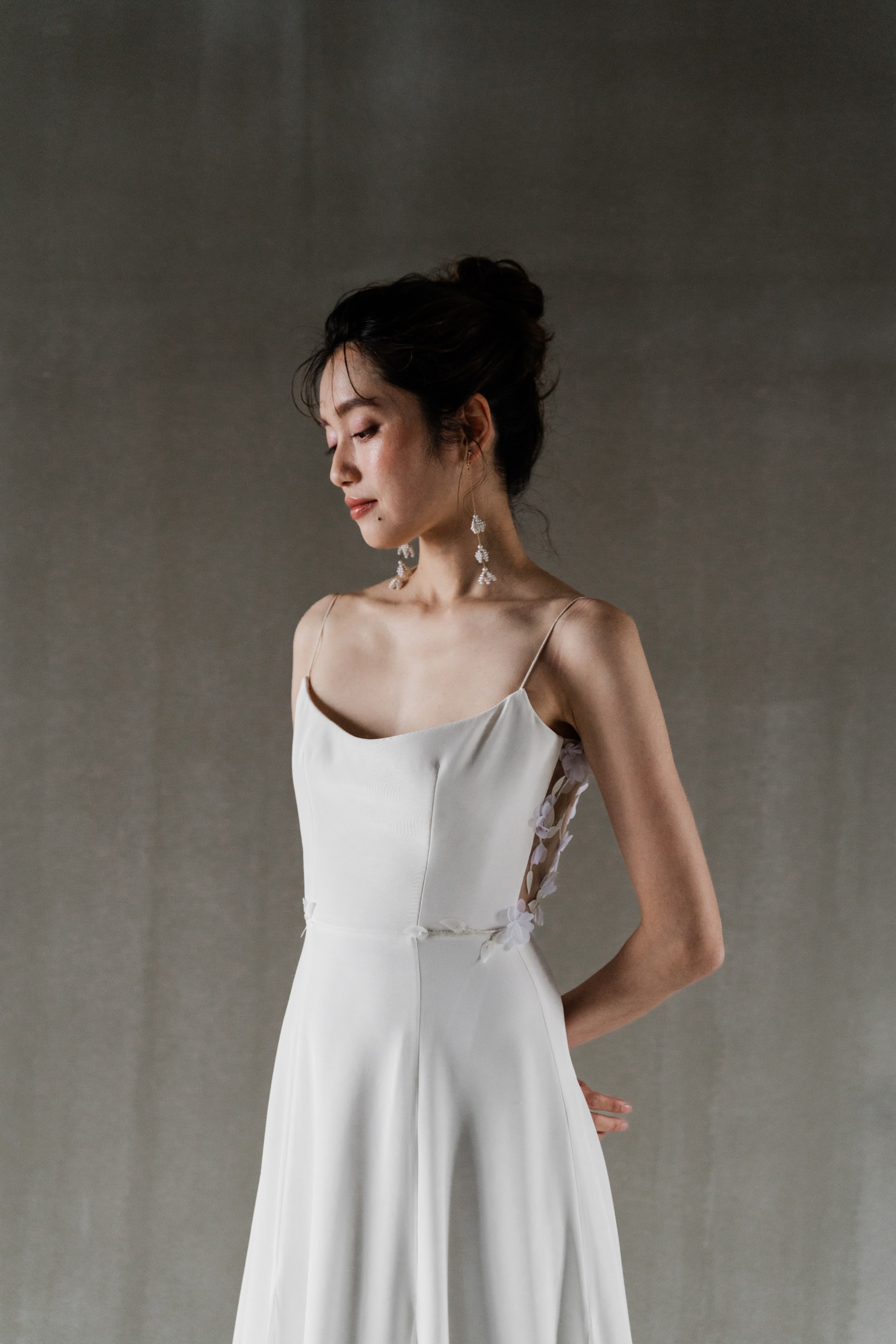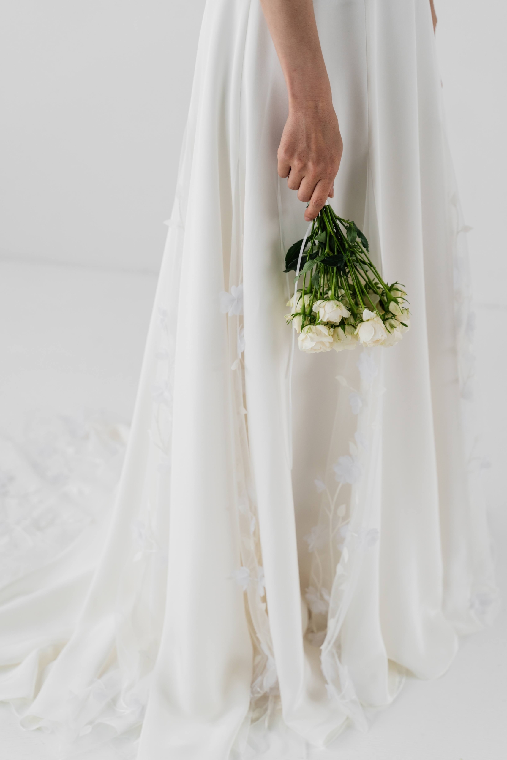 シンプルで滑らかなクレープ生地は重量のある素材が使用されているため、その効果は大きなドレープとなりエレガントさが一層際立ちます。